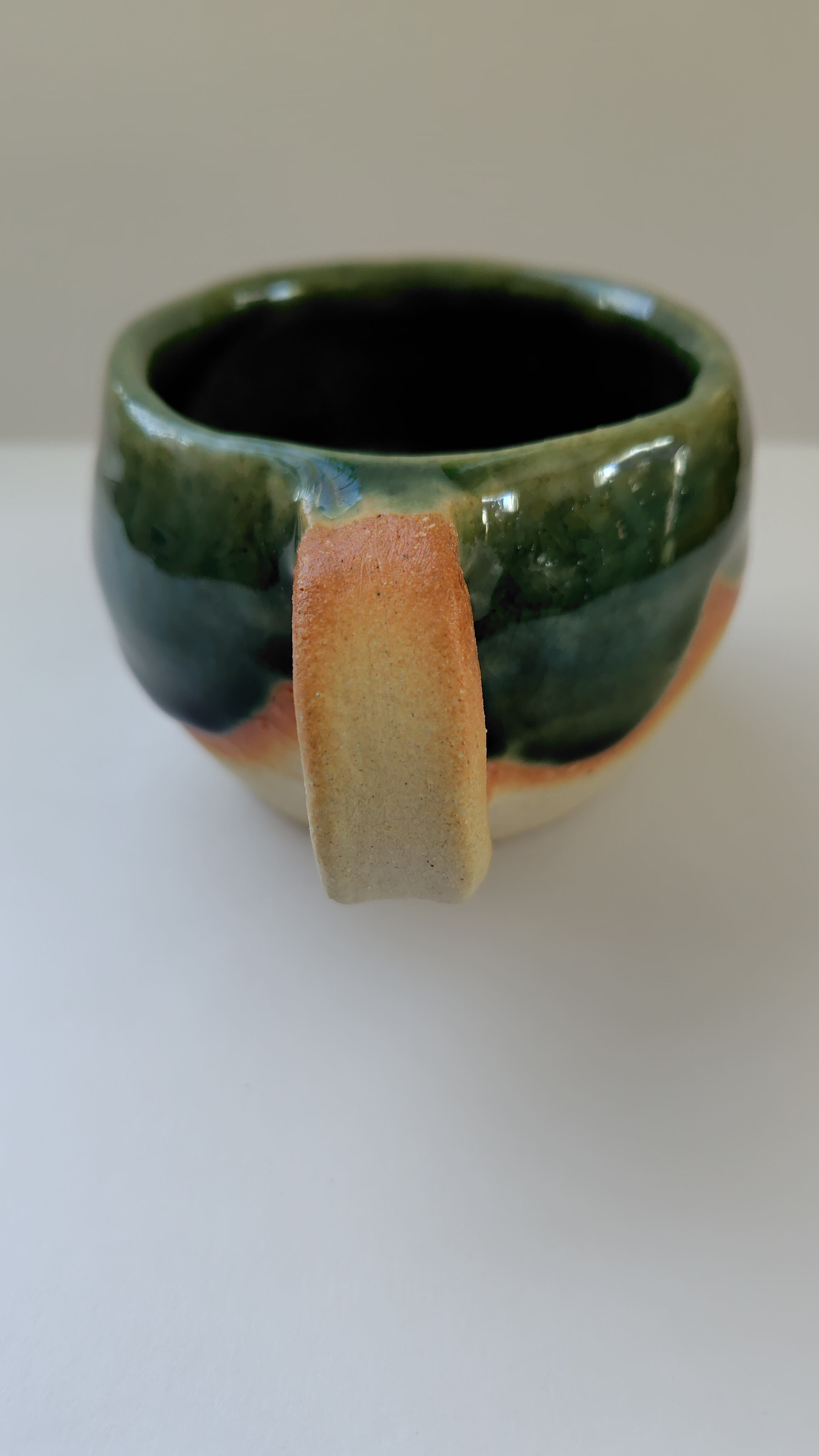 信楽白土のやベースに青ガラス釉を纏わせたマグカップです。焼いた時に出る緋色もアクセントになっています。